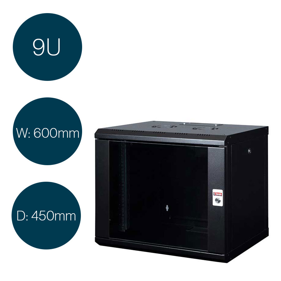 (H)9U x (W)600mm x (D)450mm Weight 17.6Kg (Black Or Grey) Lande PROline Wall Mount Cabinet LN-PR09U6045-BL Black