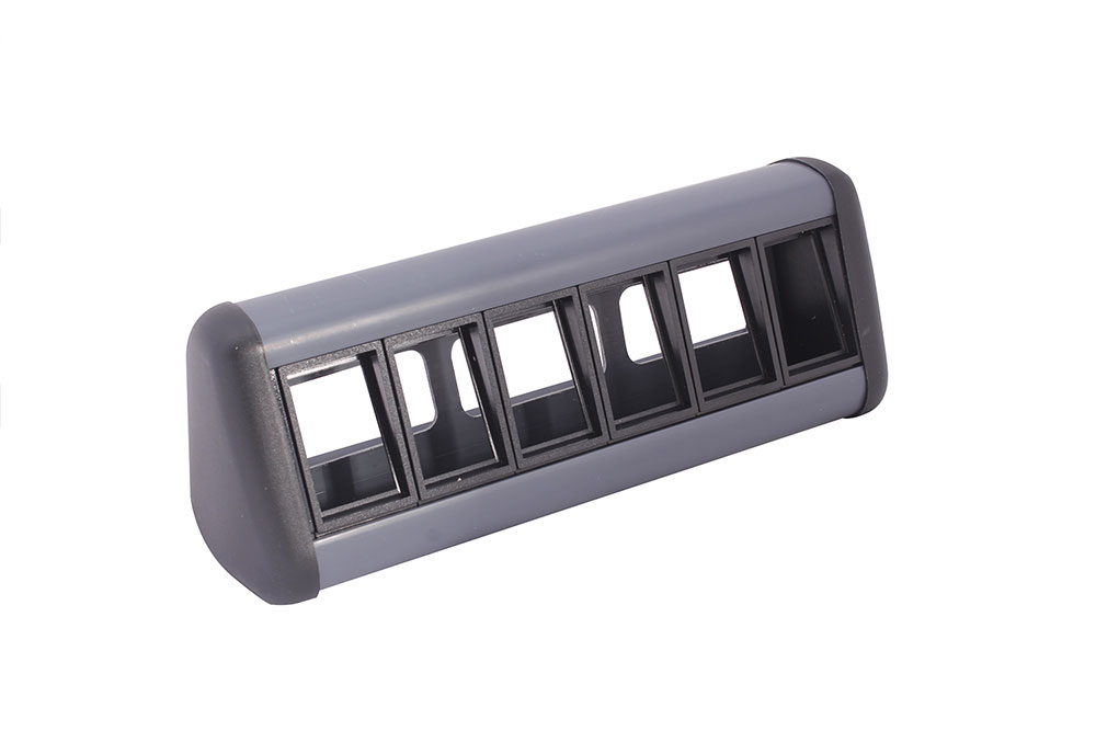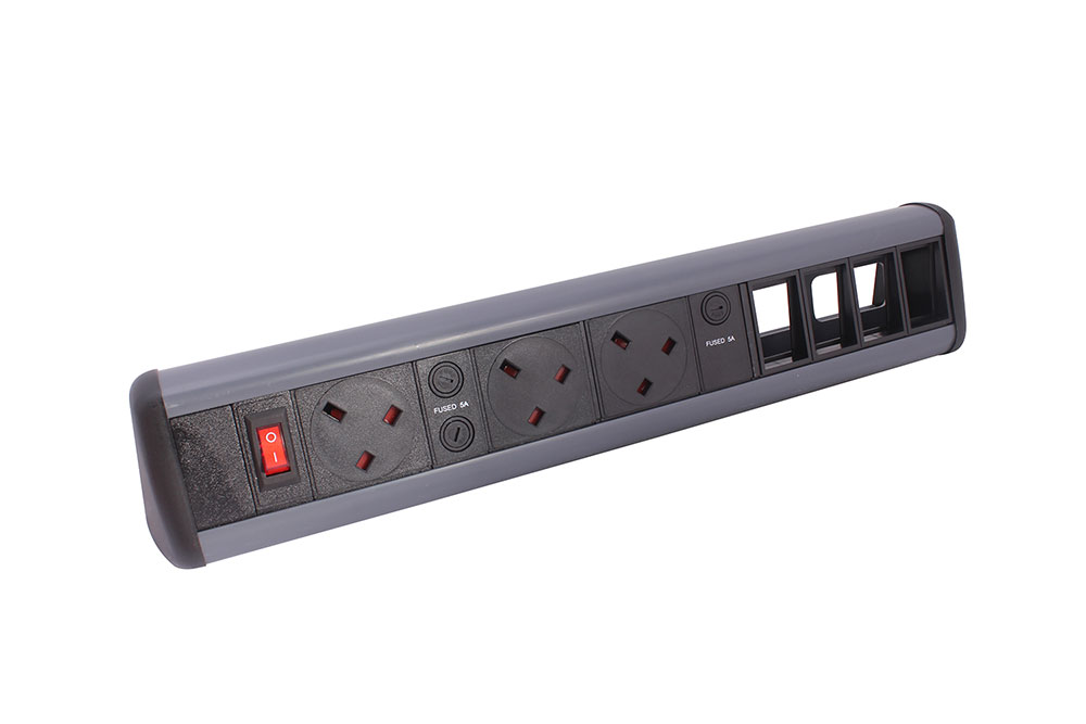 These on-desk units combine UK mains sockets with modular “6C” cut-outs (LJ6C-size) for data, voice or AV inserts — giving you power and customised connectivity in one desk-mounted unit. Mounts neatly at the desk edge or surface, ideal for flexible work-stations where both power and network/media access are needed.