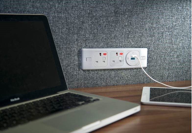 Built with commercial-grade construction and modular flexibility, each unit combines UK mains power sockets, USB charging outlets and optional data/AV ports in a surface-integrated or furniture-panel-mounted format.