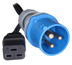 High-quality 16 A commando (BS 4343/IEC 309) male plug to IEC C19 female socket power cable — ideal for supplying equipment via a 16 A blue commando outlet to devices requiring an IEC C19 connection.
