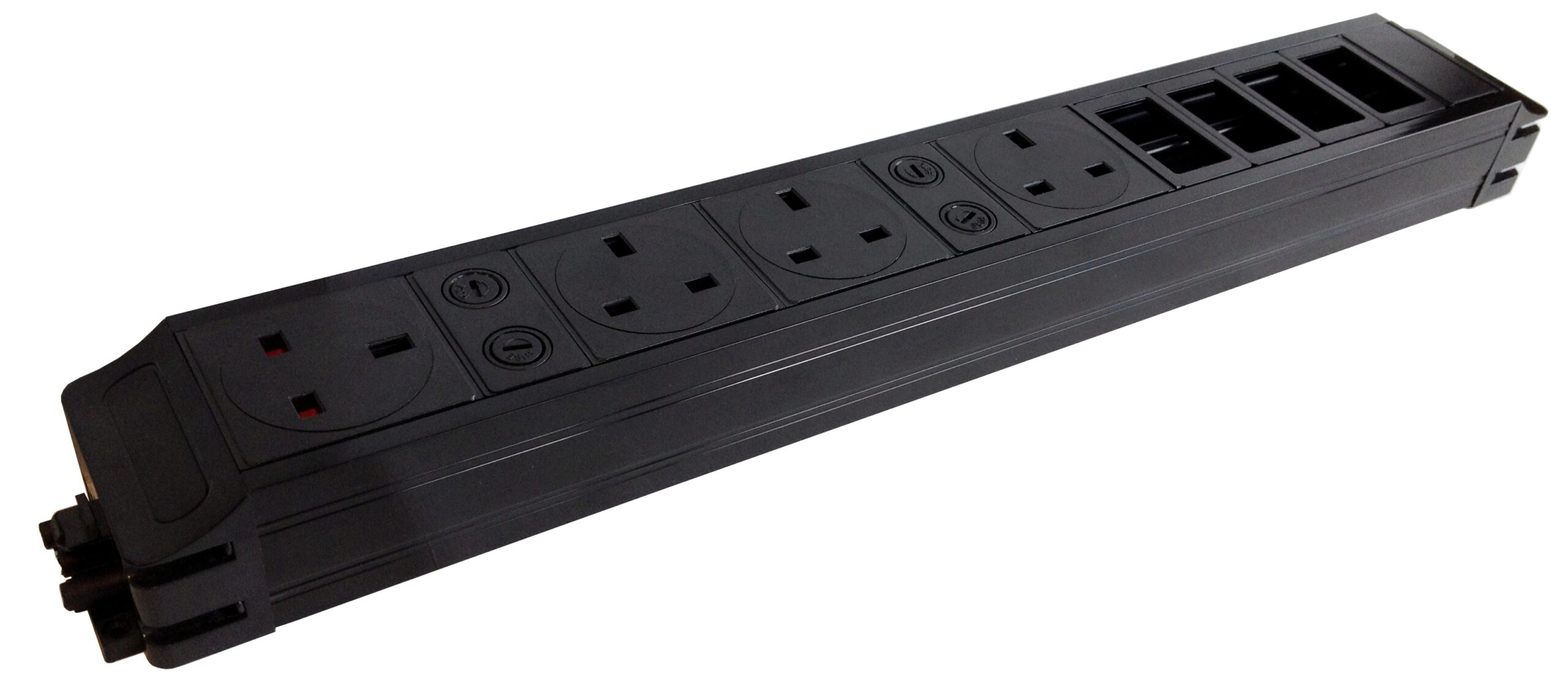 A practical under-desk modular power unit featuring 4 individually-fused UK sockets and 4 standard 6C size data/multimedia cut-outs for custom data connectivity. Ideal for mounting beneath desks or in cable trays in modern offices.