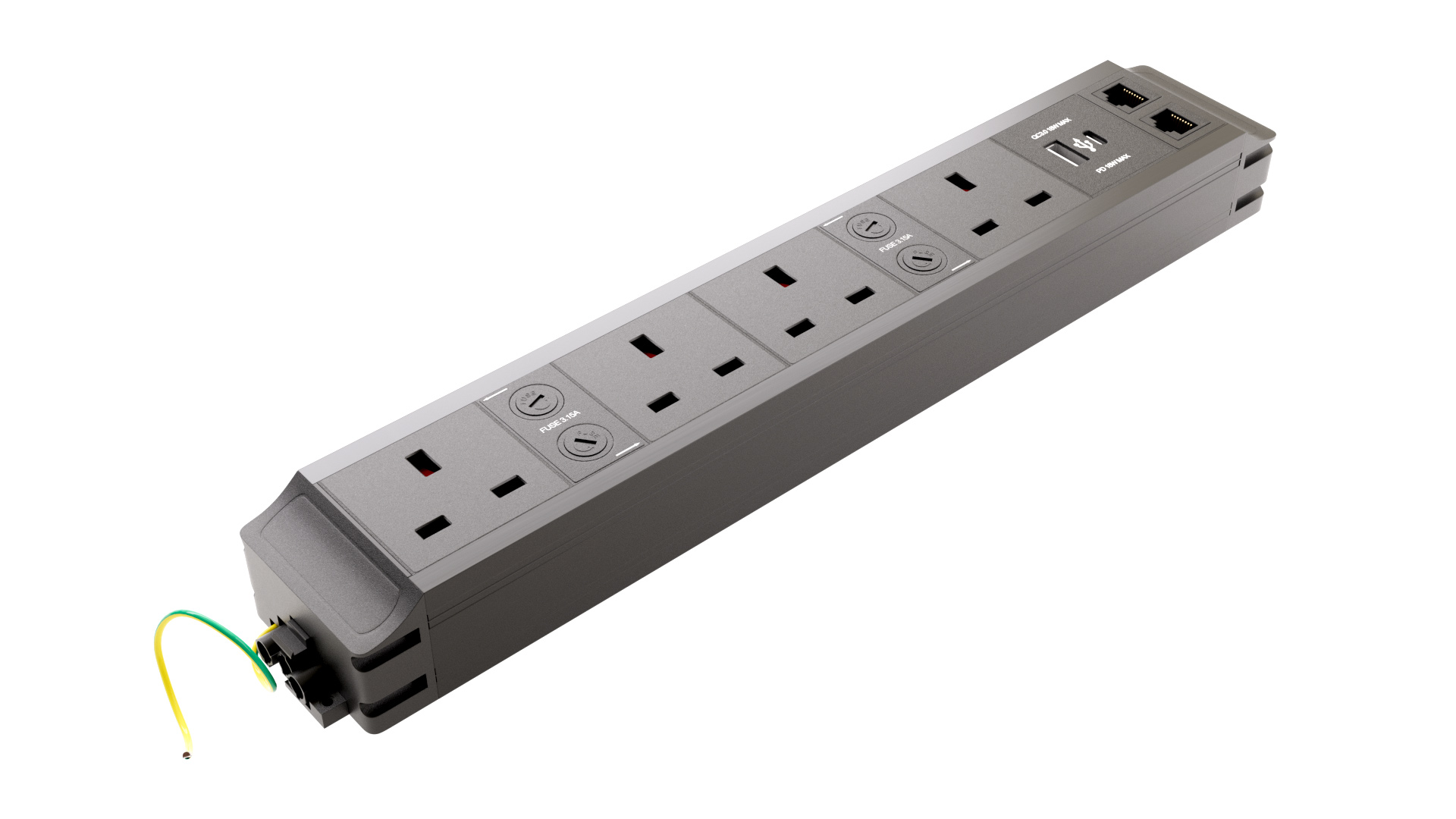 A compact and high-function under-desk modular power distribution unit offering 4 individually-fused UK power sockets, built-in CAT 6 input/output data couplers, and a dual-format USB charger (Type-A + Type-C). Designed for mounting under desks or into cable tray systems, and compliant with modern workstation power standards.