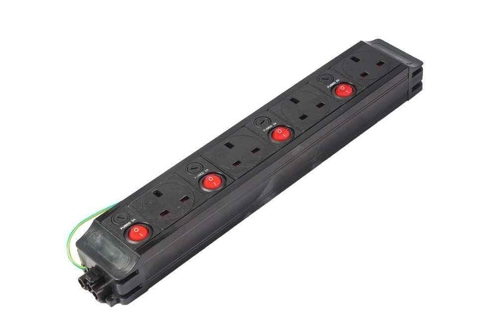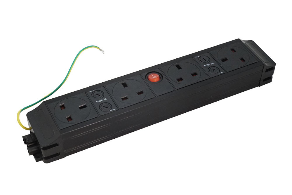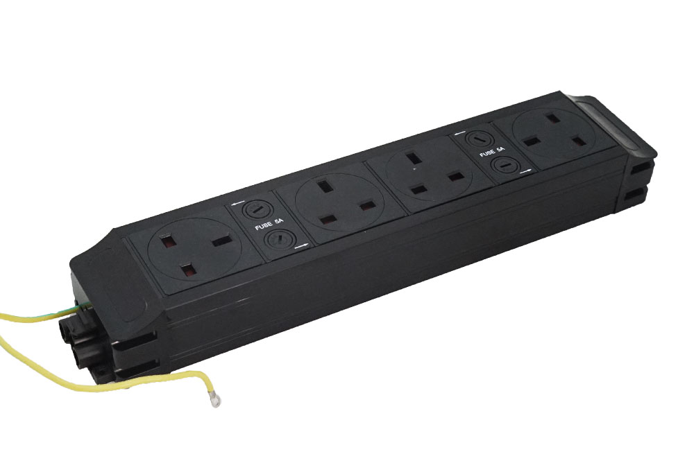 Four UK mains sockets, each individually fused at 5 A for safety and segmentation.