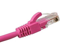 Pink CAT5e Snagless Patch Leads constructed on UTP 24AWG (7/0.195mm) 4 Pair (Stranded Bare Copper) PVC cable. The ends are terminated with fully injection moulded 50µm gold plated (8P8C) RJ45 plugs.