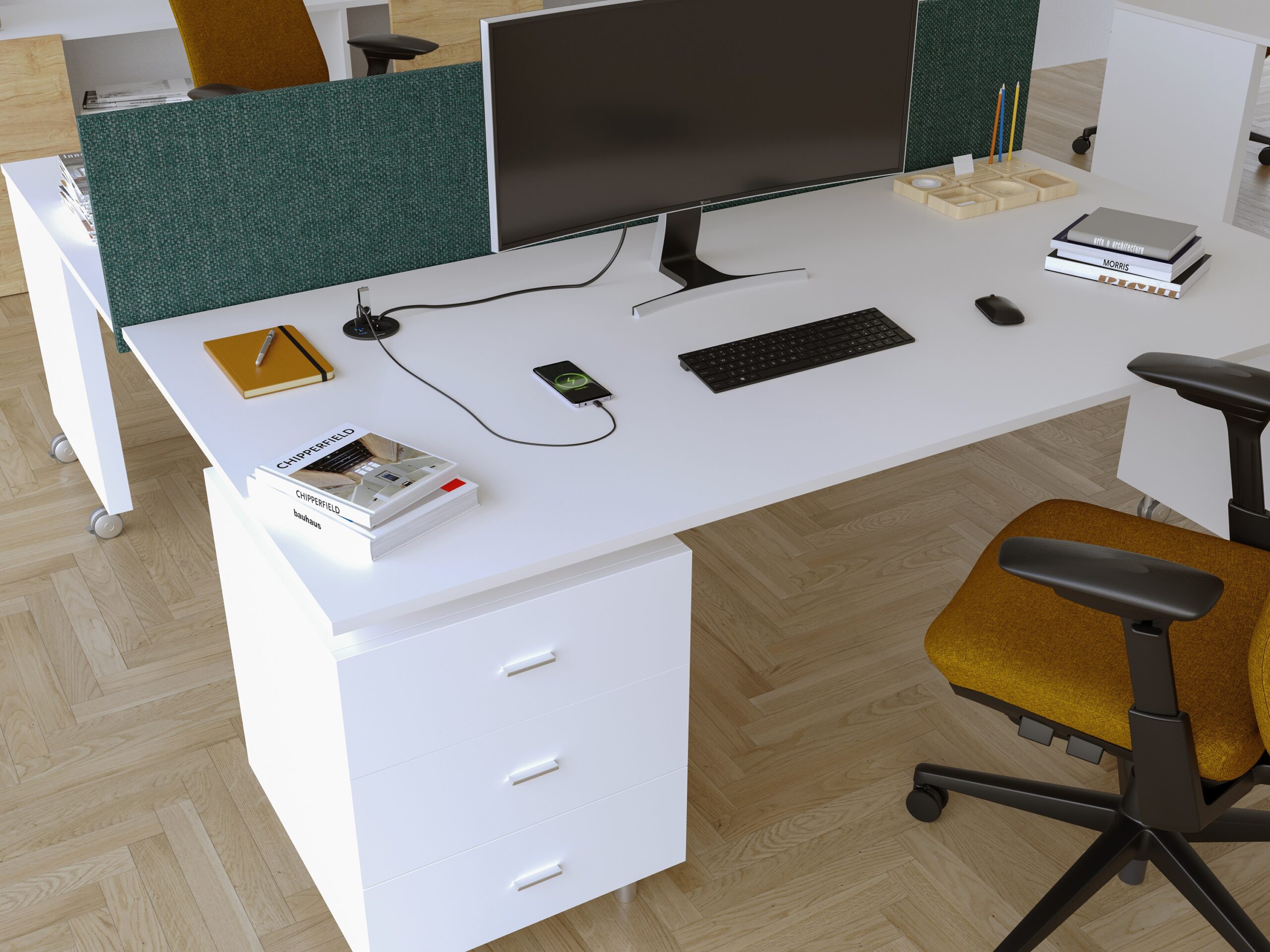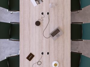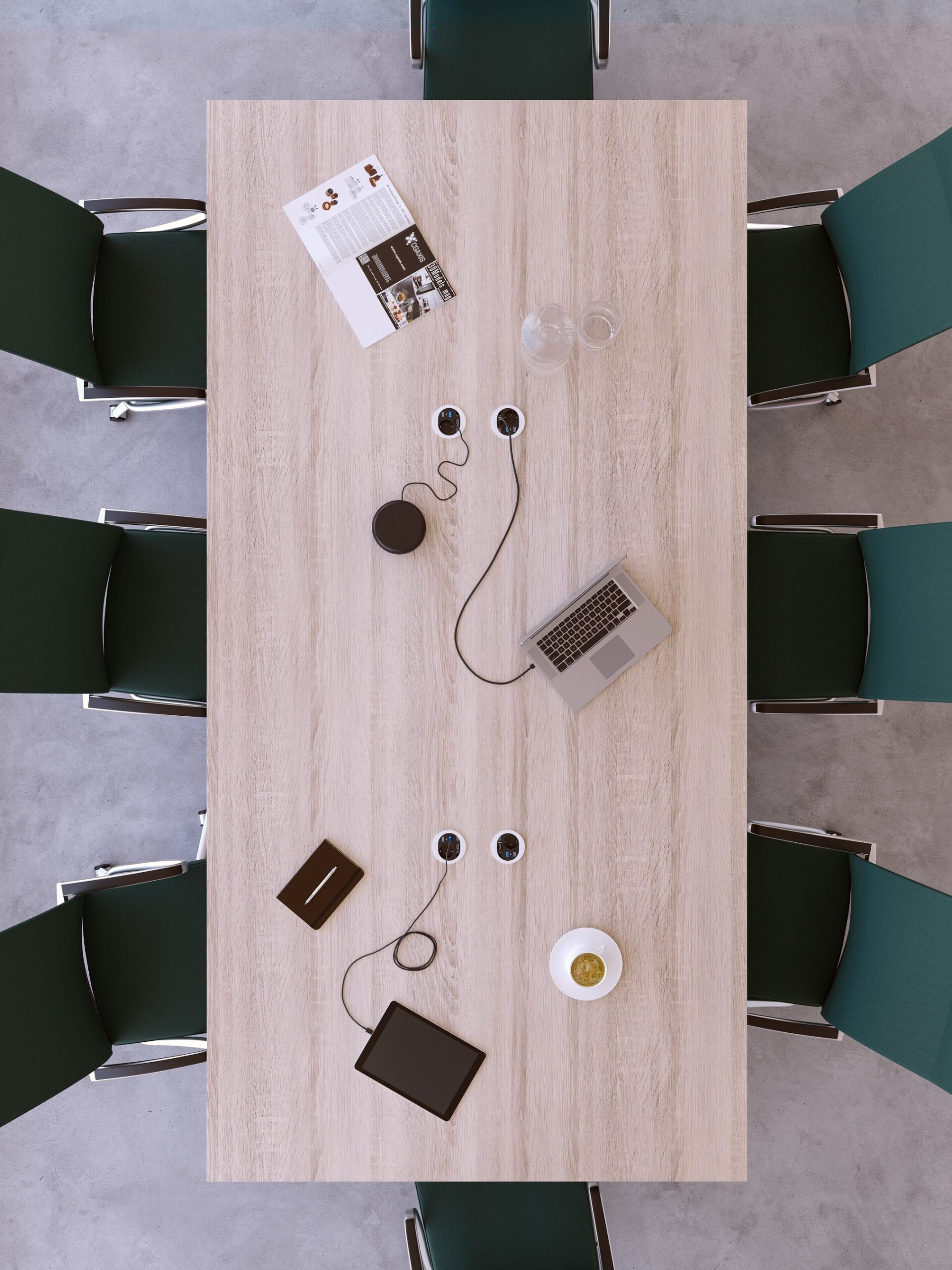 Divus allows to integrate all the connectivity needs of a workstation in only 80mm diameter, combining 1 power outlet, up to 2 USB charging connections, 1 data or multimedia connector and 2 cable grommets.