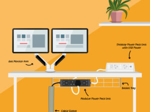 The DRD Desk Package is a complete workstation power & cable-management bundle designed to give you everything you need for a clean, efficient, and flexible desk setup. It’s ideal for sit/stand desks, agile work-spaces or furniture fit-outs where power, monitor support and cable routing need to be integrated seamlessly.