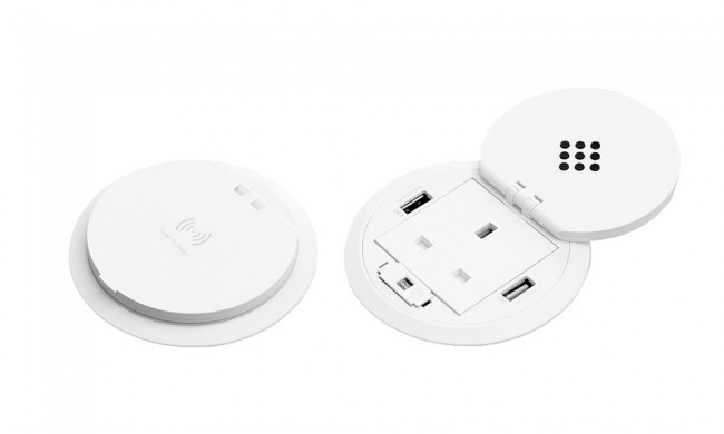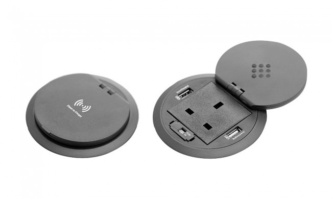 Provides easy access to power and charging at the desk surface while keeping cables tidy underneath.