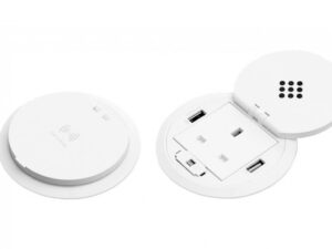 Desk Grommet Power Module — available in black or white finish, featuring dual USB-A & USB-C charging ports and optional keystone cut-outs for media or data modules.