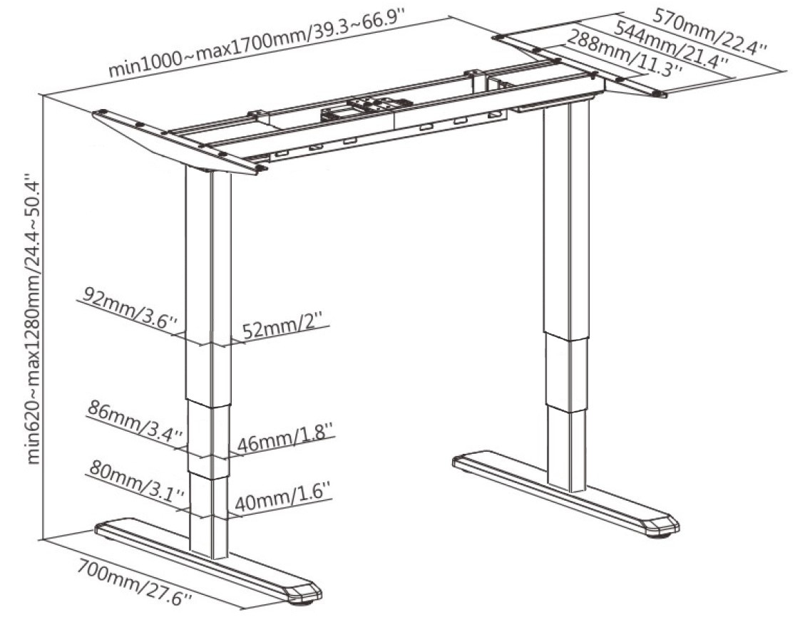 Dual quiet electric motors for smooth height transitions from 62 cm up to 128 cm.