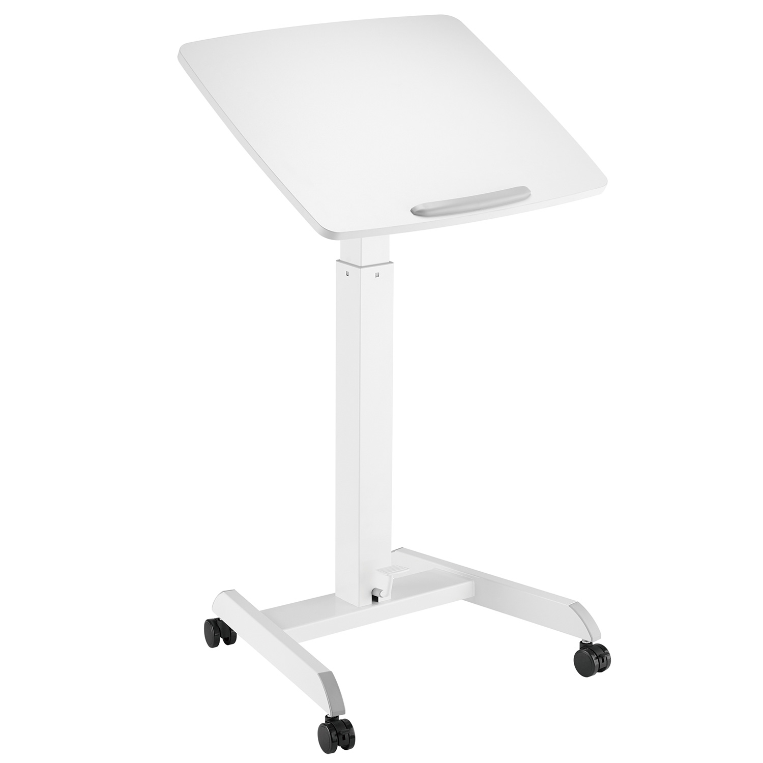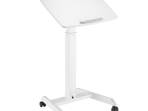 Multi-purpose, mobile, height-adjustable workstation designed as a laptop desk, lectern or reception desk. Features a gas-spring lift mechanism, large durable MFC top and lockable castors for versatility and mobility.
