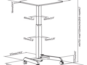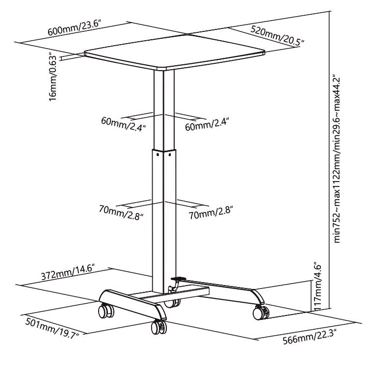 Gas spring powered height adjustable laptop table, height range 75 – 112 cm ( 29.6″ – 44.2″) , simply step on the pedal to raise the work top effortlessly and smoothly
