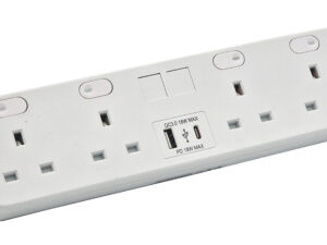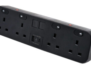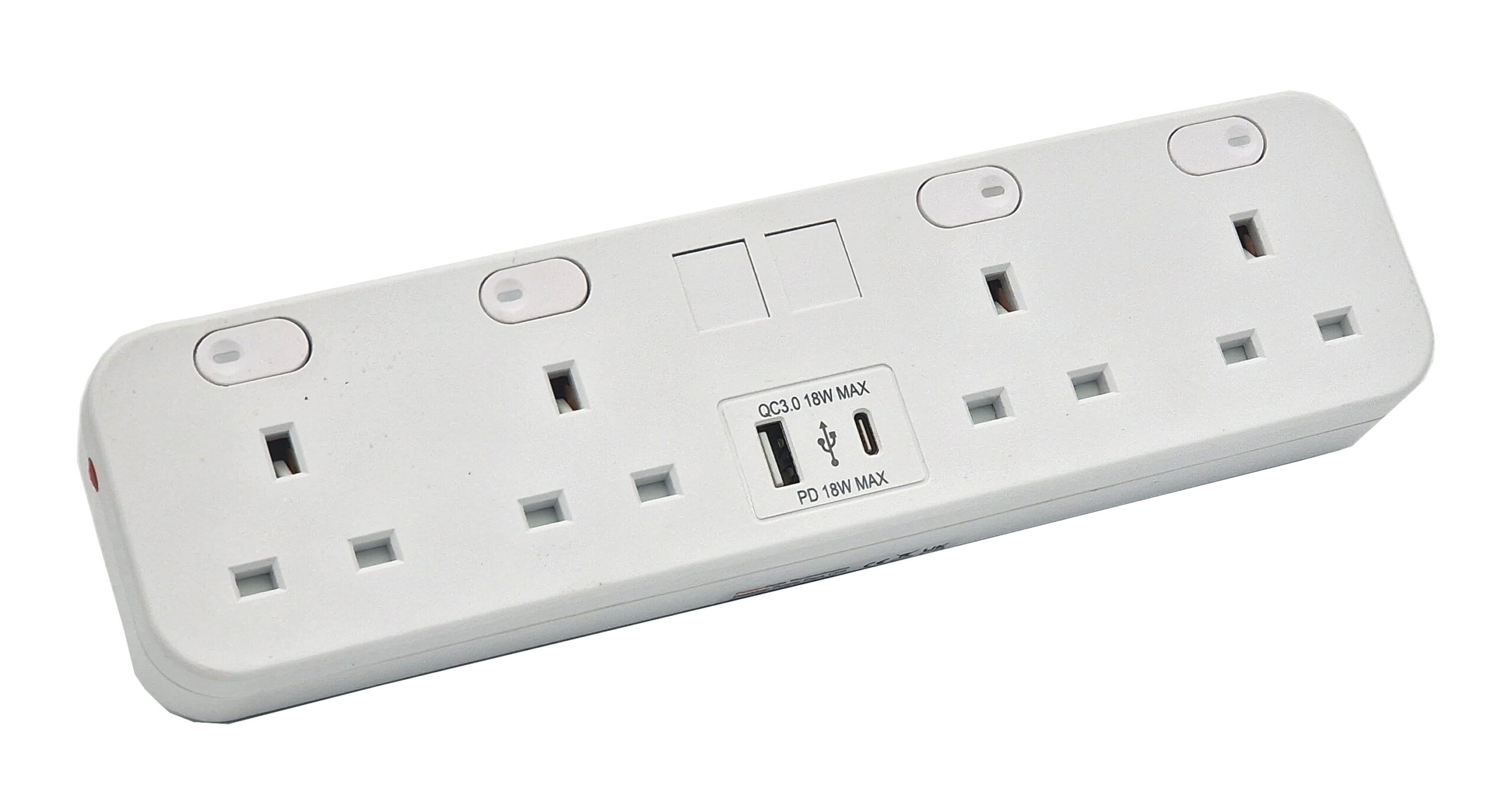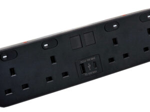 4 × individually switched UK BS1363 sockets – each one protected by a resettable thermal fuse to meet the latest commercial installation standard BS6396:2022.