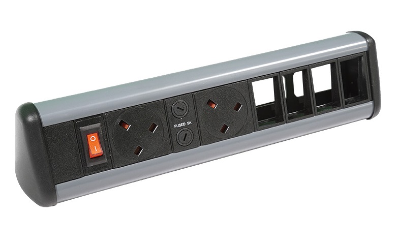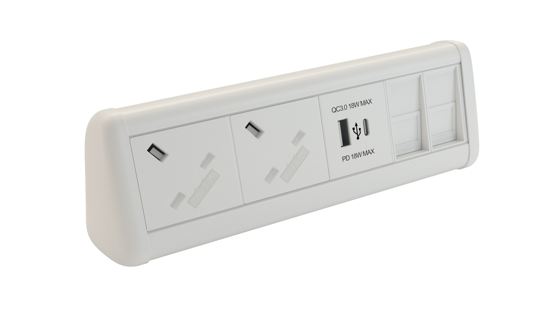 2 × keystone media slots supplied (can be populated with Cat6, HDMI, USB A, USB C, blank modules) allowing power and data/AV integration—ideal for modern workstations that need connectivity and power in one.