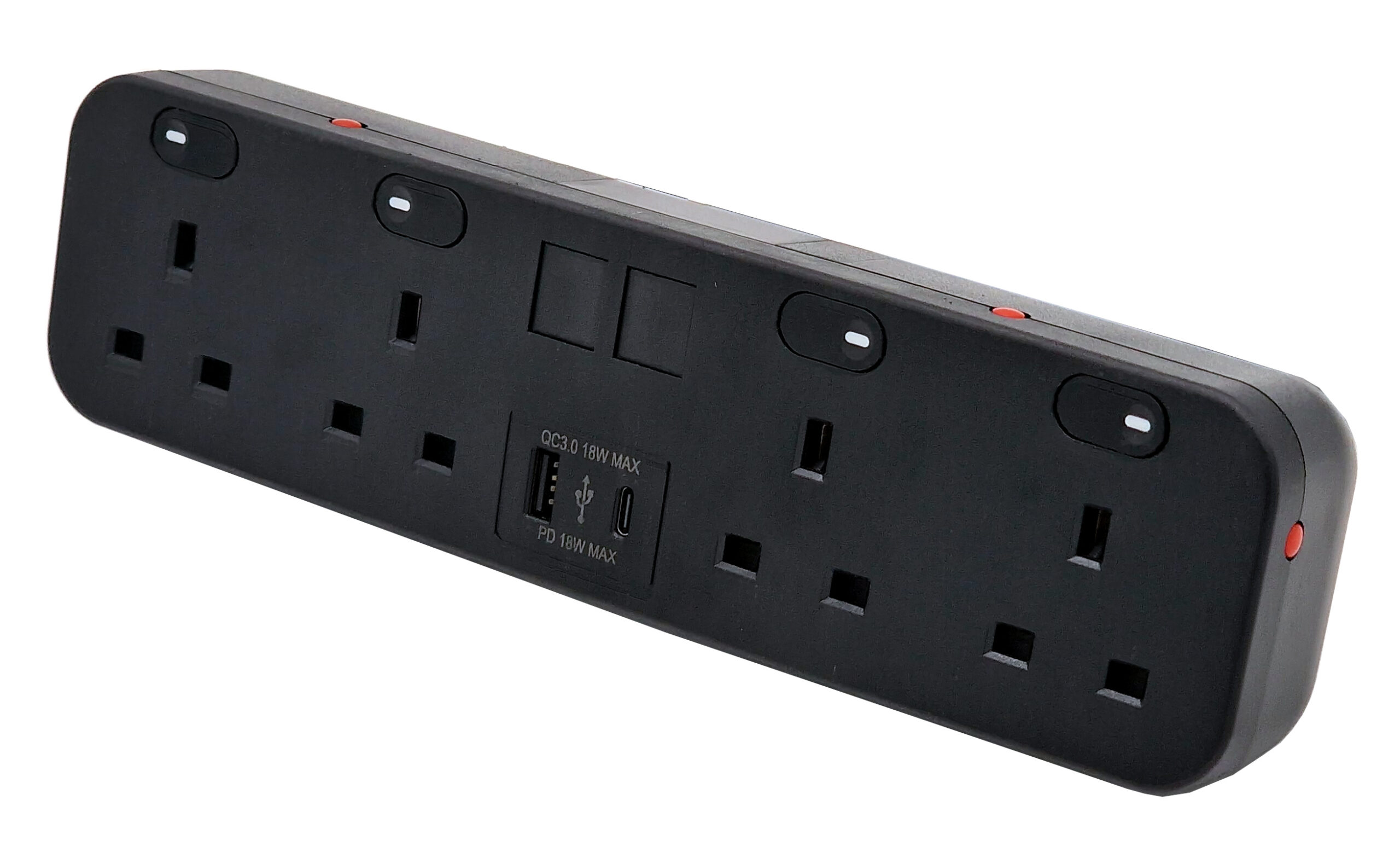 2 × UK BS1363 mains sockets, each with individual rocker switch for flexible control.