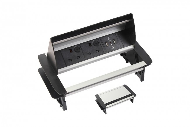 Crafted with a stylish aluminium finish, the unit integrates seamlessly into desks and shared workspaces, offering both mains and USB charging in one clean solution. Designed for professional installations, it’s UKCA & CE certified and includes features to ensure tidy cable entry and secure mounting.