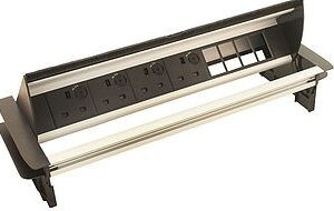 This premium in-desk horizontal module brings power, data and multimedia connectivity seamlessly into the desktop. Featuring 4 UK BS1363 mains sockets (each individually 5 A fused) alongside 4 configurable 6C cut-out modules (for Cat6, HDMI, USB-A/C, audio). The unit is designed for a desk cut-out of 132 mm × 385 mm and is styled with a sleek aluminium finish and brush‐seal cable entry.