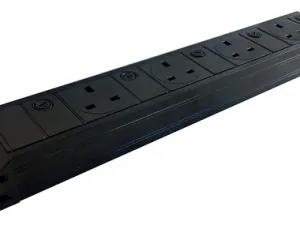Compact under-desk power feed unit offering 4 individually fused UK sockets plus a built-in 16 A RCBO for enhanced circuit protection. Ideal for neat under-desk or cable tray installations in offices.