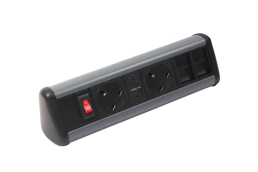 P-Pack Desktop Unit – 2 UK Power Sockets + 2 Network (Cat6) Sockets with Master Switch
