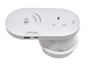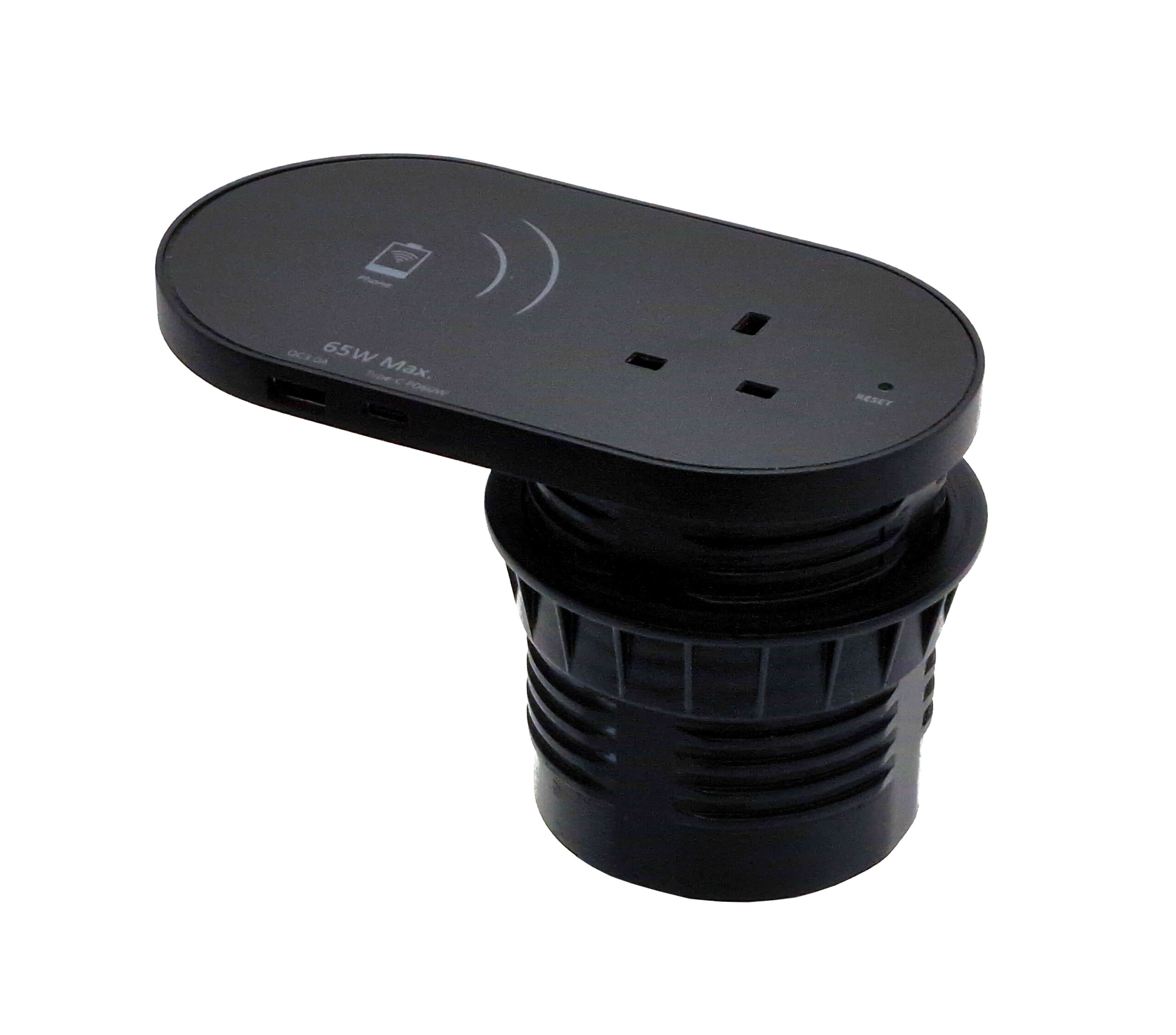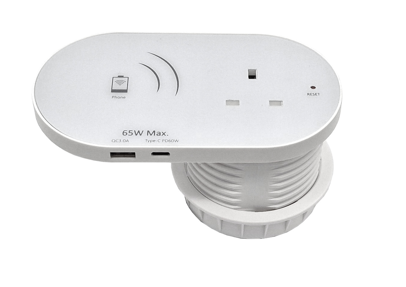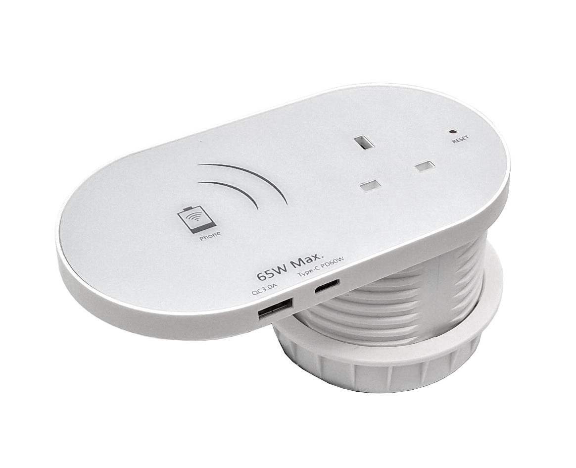 The PD COMBO 65W QI Charging Station is your go-to integrated desk grommet power solution. Whether you’re in a modern office, hot-desk environment or dedicated workspace, this unit delivers mains power, high-speed USB-C/USB-A charging and wireless Qi charging—all without adding clutter.