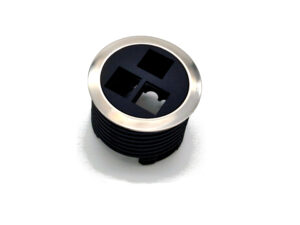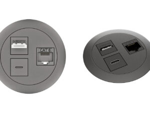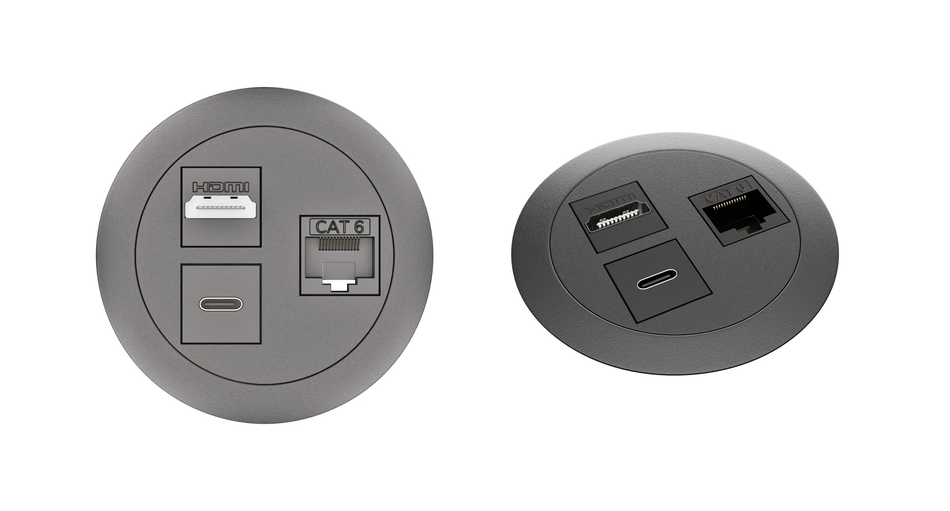 Compact media module designed for a 60 mm desk grommet cut-out, allowing you to integrate Data (Cat6/Cat6A), HDMI, USB-A or USB-C keystones into a streamlined finish—ideal for meeting rooms, workstations and collaborative zones.