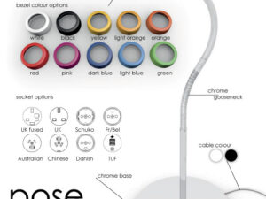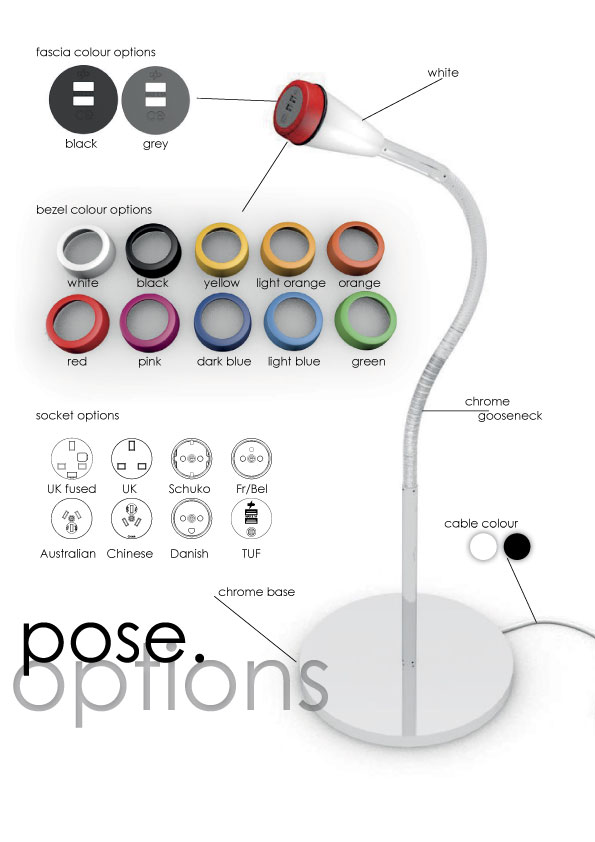 The POSE features a flexible gooseneck (620 mm or 1000 mm height variants) attached to a compact polycarbonate power module that houses mains sockets or USB charging modules.