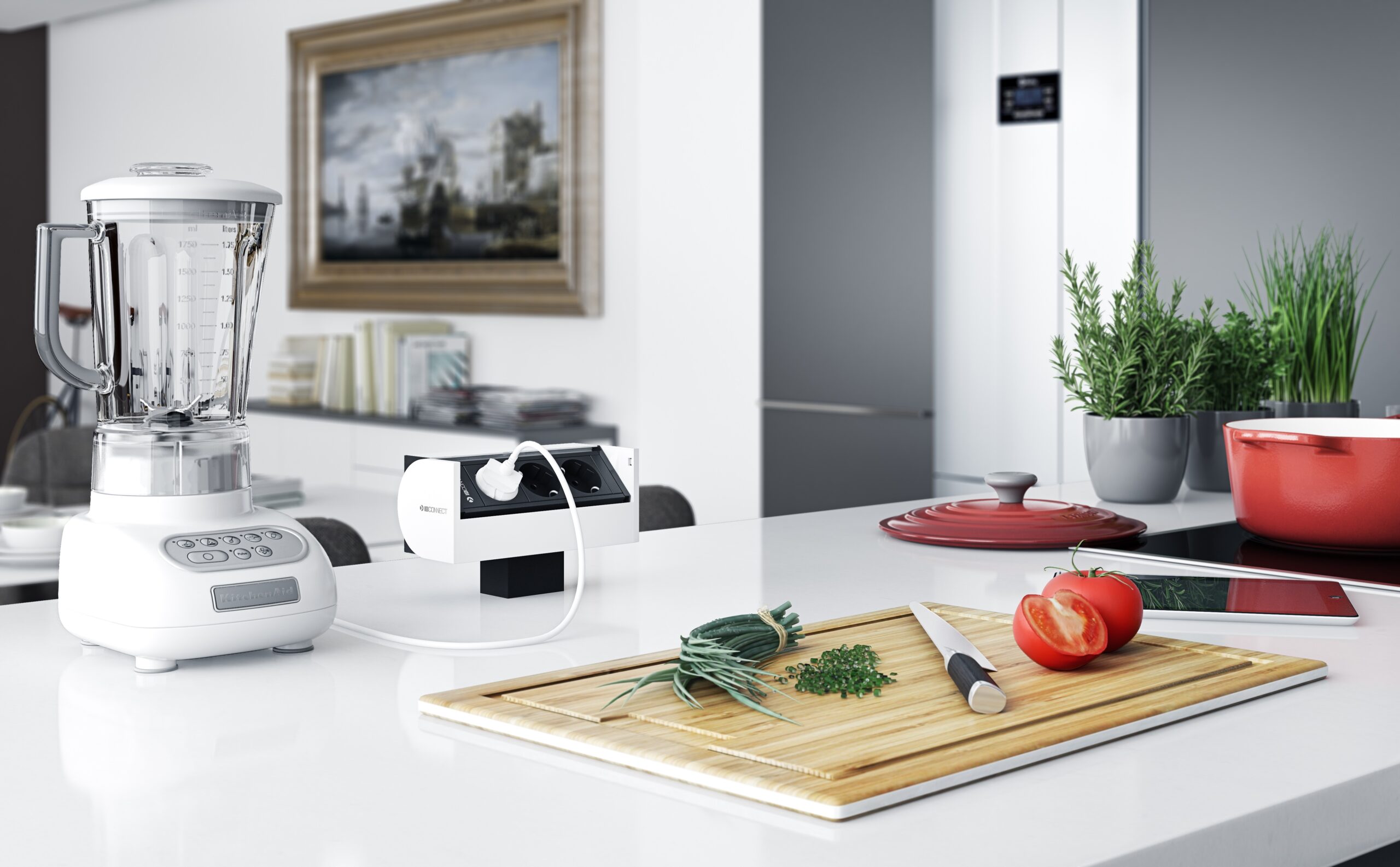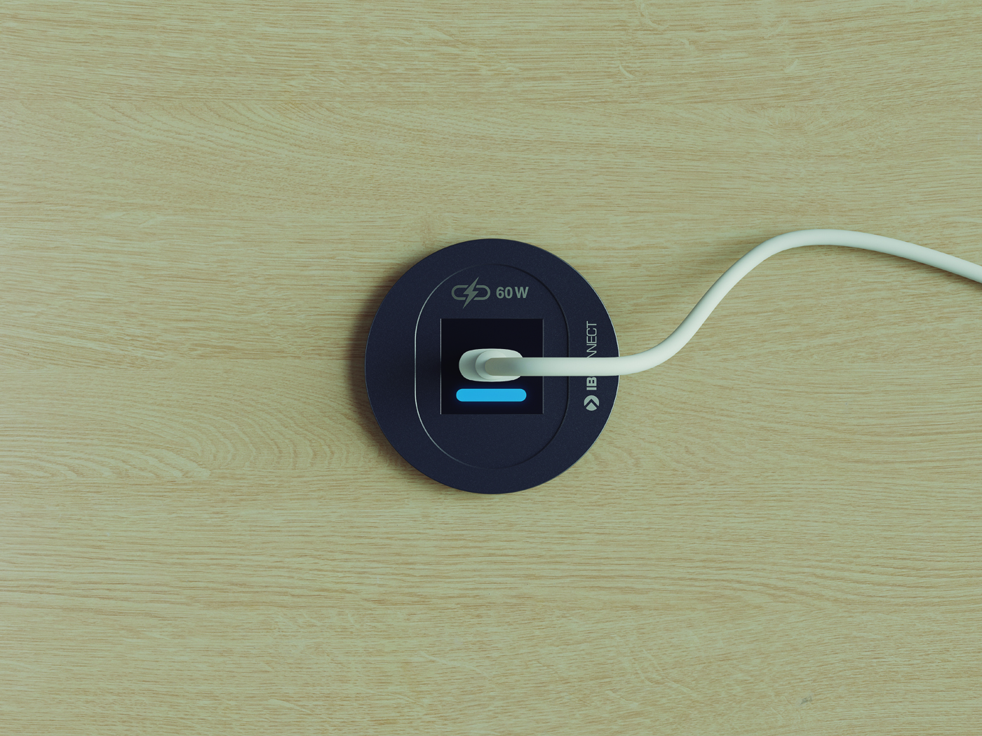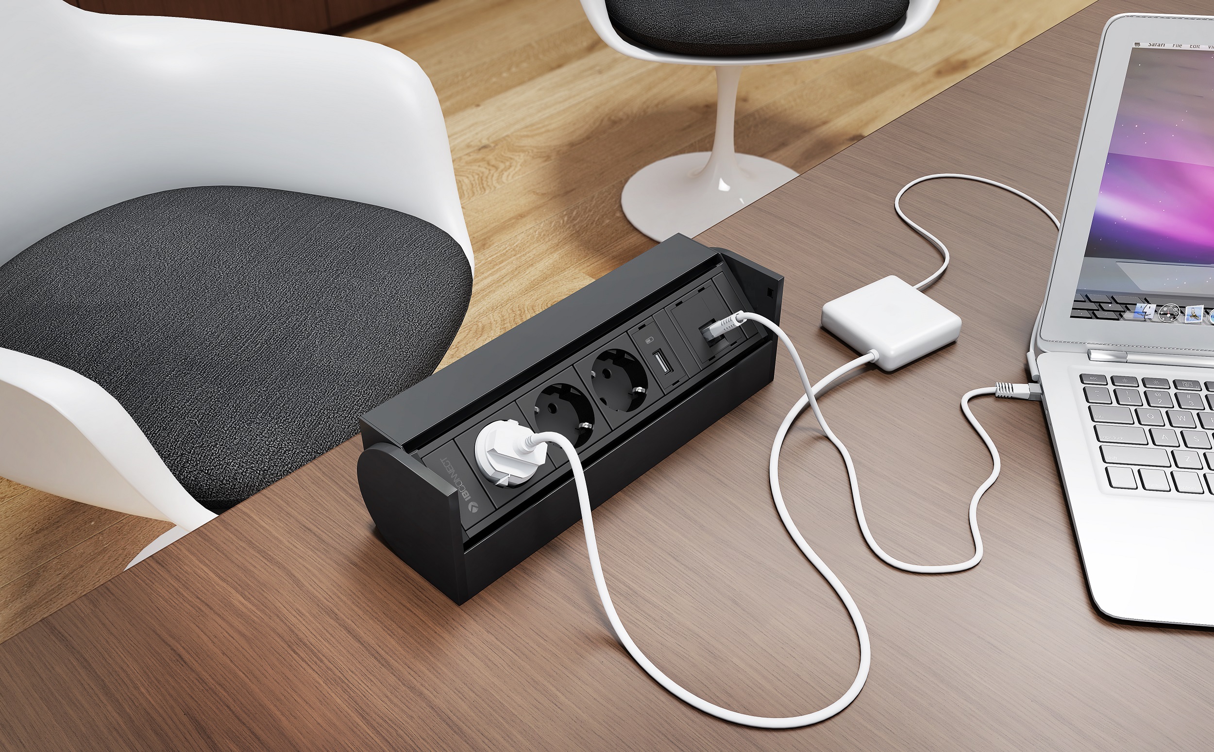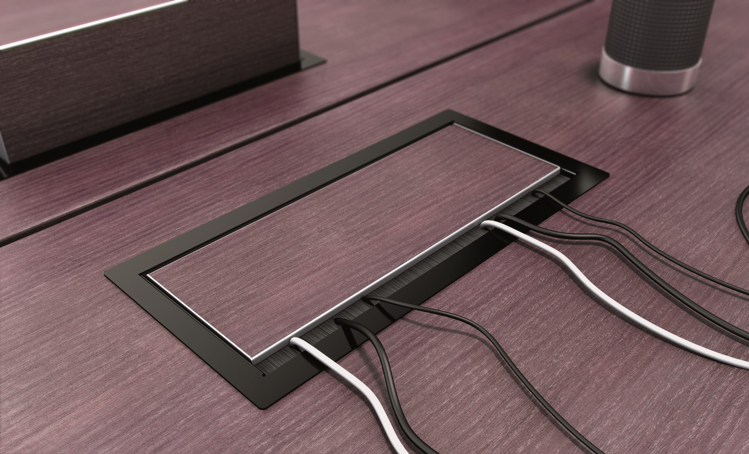 Its rotating lid hides the electrical sockets and multimedia elements when they are not in use. The entire cabling and fixation system are concealed, making it an ideal solution even for glass finishes.
